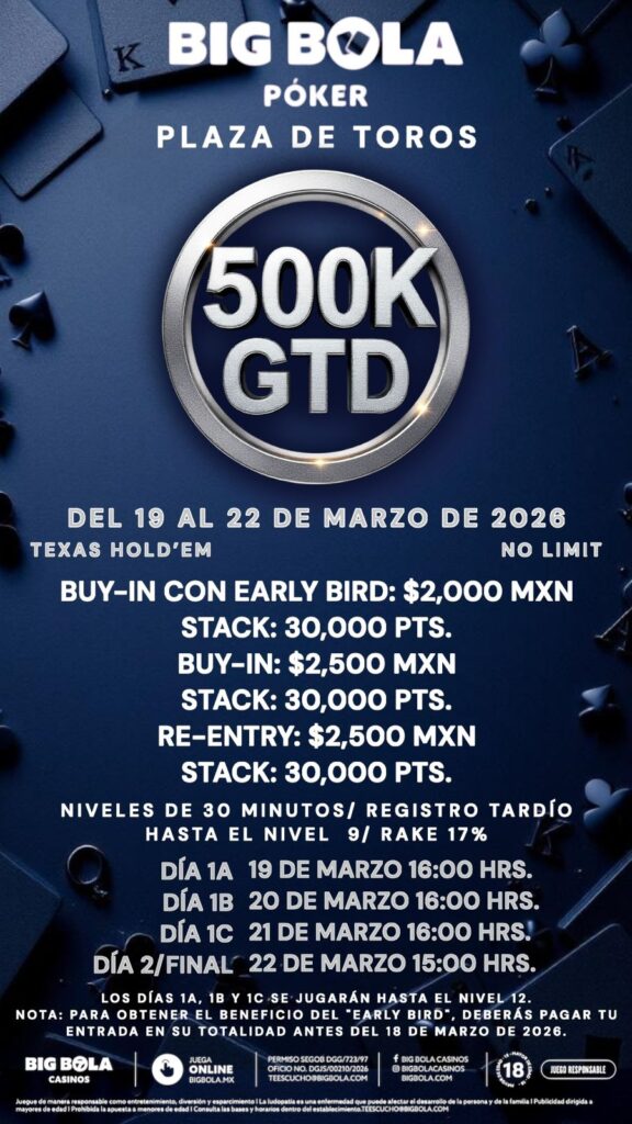 El circuito de poker en México 🇲🇽 sigue sumando eventos atractivos para jugadores recreacionales y regulares, y esta vez la acción llegará nuevamente a la ciudad de Santiago de Querétaro con un torneo que promete buena estructura y una experiencia premium. La sede será Big Bola Plaza de Toros, con una bolsa de MX$500,000 entre el 19 y el 22 de marzo de 2026.