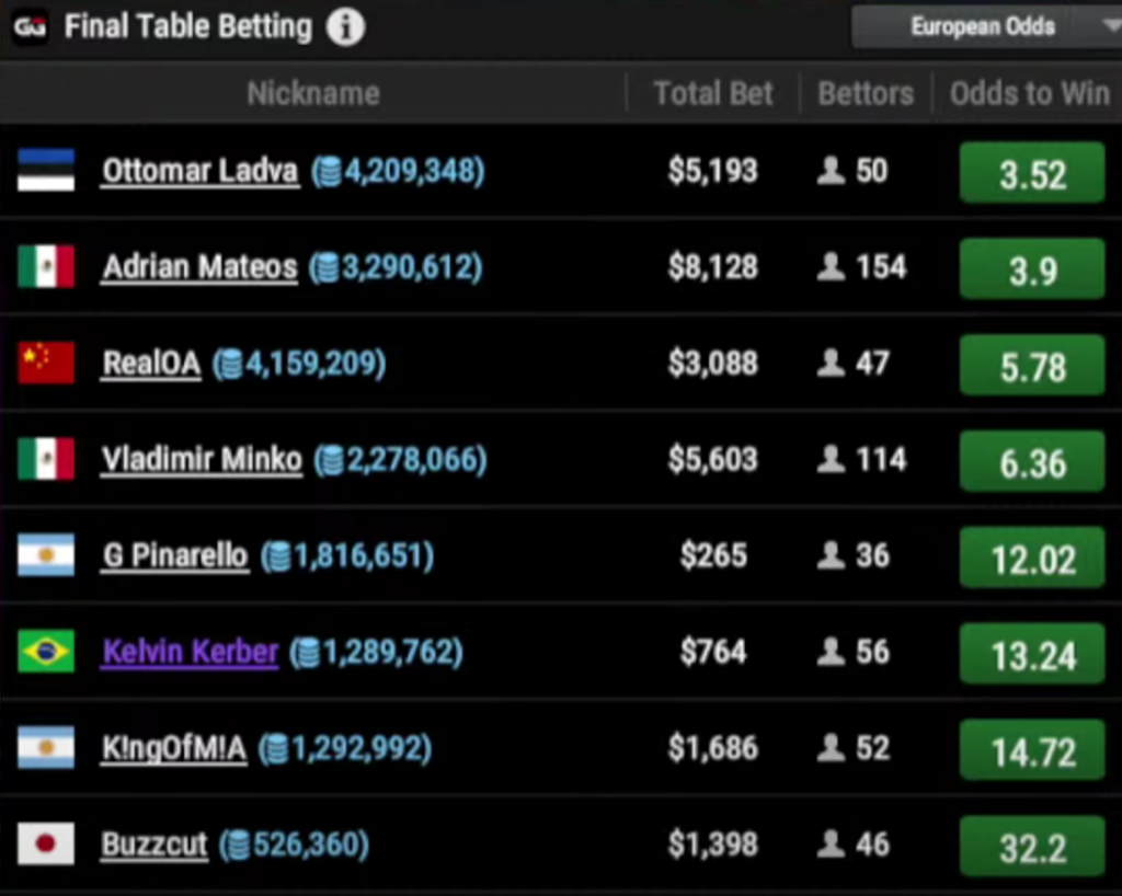 El estadounidense Eric Yanovsky 🇺🇸, con bandera Argentina y bajo el pseudónimo de K!ngOfM!A, fue el primer eliminado de la mesa final oficial transmitida, cobrando el octavo puesto por US$63.204.
