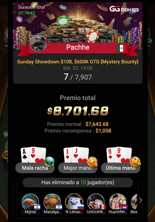 El domingo volvió a dejar huella para el poker mexa. El regiomontano Alan Pacheco 🇲🇽, conocido en GGPoker como “Pachhe”, alcanzó la 7ª posición en el Sunday Showdown $108, US$600K GTD [Mystery Bounty], un torneo que reunió 7,907 entradas y generó un impresionante prize pool de US$785,639.52.