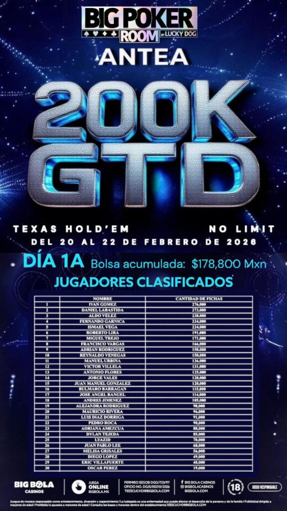 El ANTEA 200K GTD en Seven by Big Bola Querétaro 🇲🇽 ya está en marcha… y el inicio no pudo haber sido mejor. El Día 1A registró un total de 130 entradas, generando un prize pool de MX$178,800, una cifra que prácticamente roza el garantizado de MX$200,000 desde el primer vuelo.
