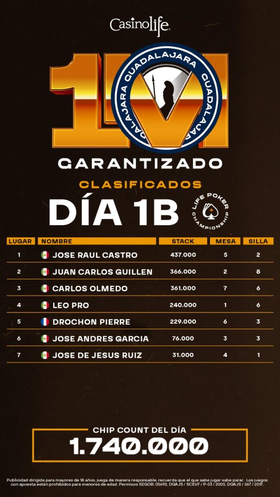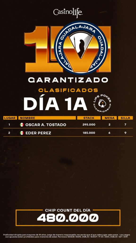 El 1M Garantizado de Guadalajara continúa su marcha en el Life Poker Room, y ya dejó sus primeros clasificados rumbo al Día 2. Con una gran estructura y toda una semana por delante, los vuelos 1A y 1B se completaron exitosamente, sumando los primeros nombres que buscarán avanzar hacia la gran final del torneo que reparte MX$1.000.000 garantizados, bajo la grandiosa dirección de Juan Carlos Rivera.