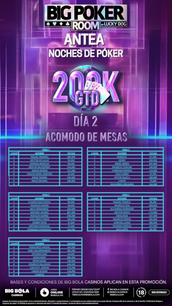 El Big Poker Room by Lucky Dog en Big Bola Antea 🇲🇽 registró una excelente participación durante los vuelos clasificatorios del 200K GTD, logrando 240.465 pesos acumulados tras finalizar el Día 1B. Con esta cifra, el evento no solo supera el garantizado inicial, sino que se perfiló al cerrar con una muy buena bolsa de premios durante la jornada decisiva del Día 2, que se dispuratá hoy a las 17:00h.
