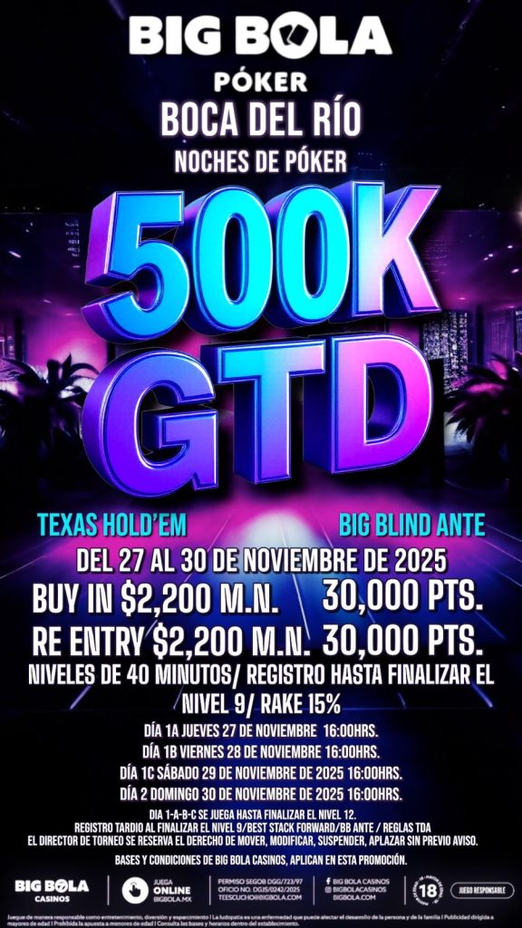 El Casino BigBola de esa ciudad costera tendrá su parada del circuito Noches de Poker, que recorre toda la geografía mexicana. Luego de su exitosa convocatoria en Quéretaro; la cadena más popular del país azteca traslada la acción de su circuito al estado de Veracruz. Entre el 27 y el 30 de noviembre, se disputará este desafío, que pondrá en juego una bolsa inicial de MX$500.000. El torneo tendrá un buy-in de MX$2.200 y tres vuelos clasificatorios. También habrá amplia acción de cash, con mesas de todas las modalidades de juego.