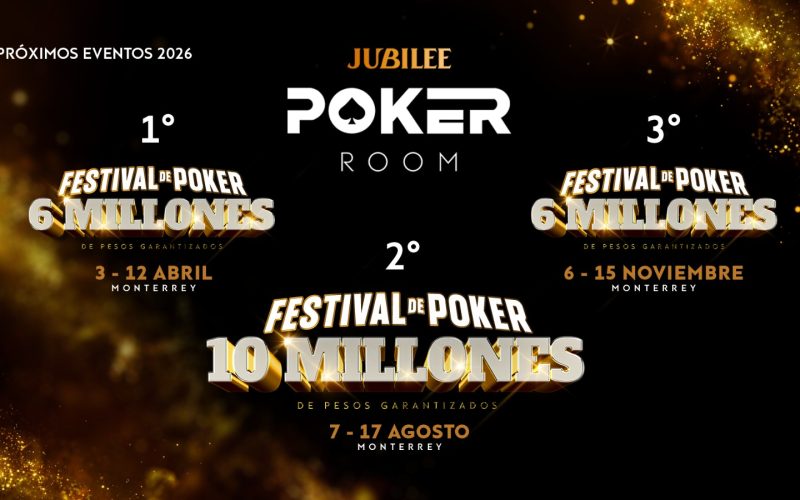 La sala de poker más visitada por los amantes de esta disciplina mental en Monterrey anunció las fechas de tres festivales con los que le apunta a ser el centro de la acción en la Sultana del Norte, durante este nuevo ciclo solar. Del 3 al 12 de abril, se pondrán en juego MX$6.000.000 (US$344.820); mientras que del 7 al 17 de agosto, se vivirá una segunda serie en la que las bolsas mínimas a entregar sumarán MX$10.000.000 (US$574.700). La cita de cierre para el Jubilee en 2026 será entre el 6 y el 15 de noviembre, con MX$6.000.000 (US$344.820) en juego.