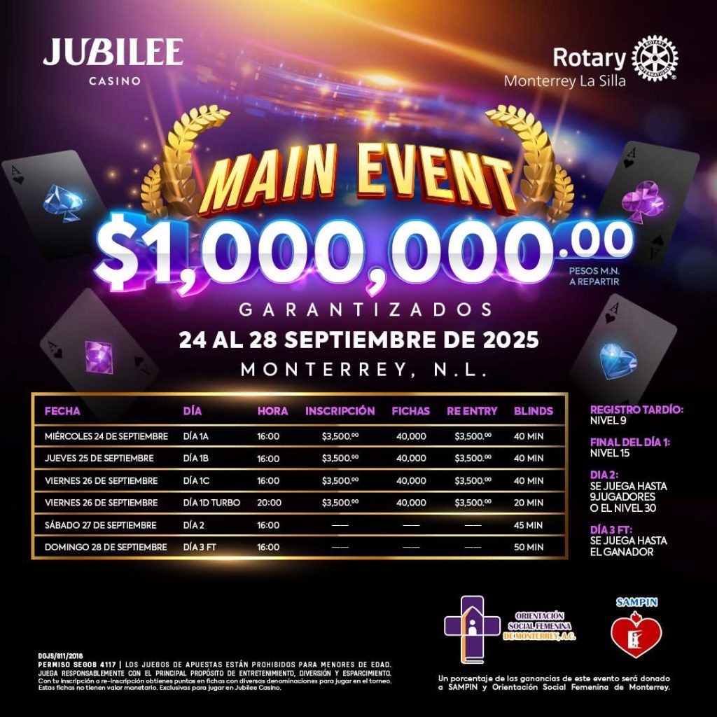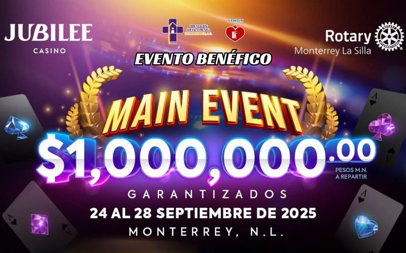 La última semana de septiembre estará cargada de acción en el mejor poker-room de la Sultana del Norte. Un High Roller y un posterior Evento Principal, con montos de MX$500.000 y MX$1.000.000 establecidos como bolsas mínimas; serán las invitaciones para que todos los amantes de esta disciplina mental en Nueva León y las regiones vecinas quieran integrarse a esta fiesta de los paños, que se extenderá entre el lunes 22 y el domingo 28 del mes en curso. Una parte del porcentaje de rake que la organización capta del recaudo, será destinado a fines benéficos.