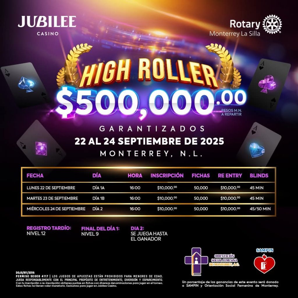 Entre el 22 y el 24 de septiembre, la primera cita en esta fiesta de los paños será el High Roller, con un buy-in de MX$10.000 y un garantizado de MX$500.000 como bolsa mínima inicial. El torneo tendrá dos vuelos de clasificación, a disputarse el lunes 22 y martes 23, con las 4:00 de la tarde como hora inicial de cada ronda. En cada una de estas veladas, se adelantarán nueve niveles de juego, con una duración de 45 minutos cada uno. El Día 2, que definirá al campeón, también empezará con el mismo horario y el registro se mantendrá abierto hasta llegar al nivel 12 (el tercero que se disputará en esa sesión). En las instancias finales, el tiempo para que suban las ciegas se ampliará a 50 minutos.