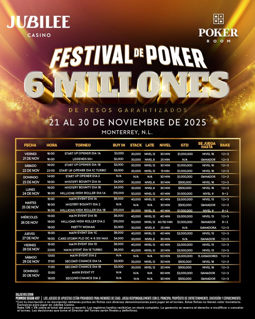 Una ciudad siempre activa en el circuito del poker de élite en el país azteca, ha sido la capital del estado de Nuevo León, al noreste del territorio nacional. Para ratificarlo, luego de haber sido sede de eventos como una reciente parada del World Series of Poker Circuit (WSOP-C); La Sultana del Norte vuelve a tener la oportunidad de convertirse en referente obligado para los practicantes de esta disciplina mental en México, gracias al festival convocado por el Casino Jubilee; a disputarse entre el 21 y el 30 de noviembre.