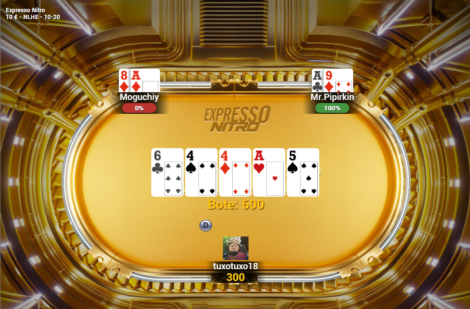 En la primera mano, Moguchiy se fue all-in con A♦ 8♦ y recibió el call de Pirpikin con A♣ 9♦ offsuit. El board cayó 6♣4♠4♦A♥5♠ pero aunque la varianza no le sonrió, con apenas unos segundos de juego ya había asegurado a su cartera €80.000 por su tercer lugar.