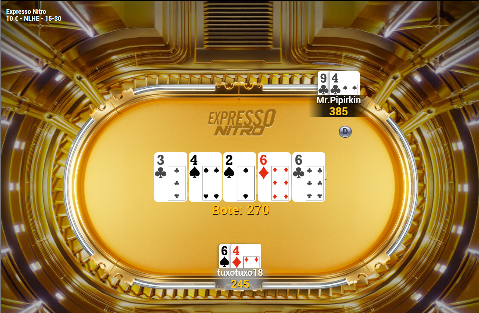 Este último se recuperó en otra mano con 7♠ 7♣, mano con la que decide shovear en el botón y recibe call de tuxotuxo18 con K♥ 3♠, el board cae 7♦5♣9♦4♦2♠ dándole set de 777’s y poniéndolo de nuevo en la partida, pero nuevamente tuxotuxo18 le volteó la partida con A♦ 2♣ frente a J♦ 10♥ en un board 6♥3♣Q♣8♣6♦ con malas noticias para Mr.Pipirkin, quién perdió contra A’s alto.