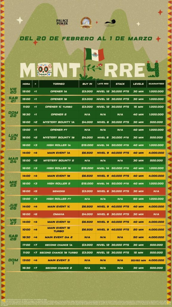 El tour de la cadena de casinos más importante del país azteca tendrá su primera parada del año en la Sultana del Norte, entre el 20 de febrero y el 1º de marzo. El festival anuncia un garantizado de MX$4.000.000 (US$230.300) en su Evento Principal, que entrará en acción el martes 24. La fiesta en la capital de Nuevo León iniciará con el torneo Opener, en el que la bolsa mínima será de MX$1.000.000. La agenda de la serie incluye también el Mystery Bounty, el High Roller, el Second Chance y eventos de un día como el Seniors y el Pot Limit Omaha 4/5.