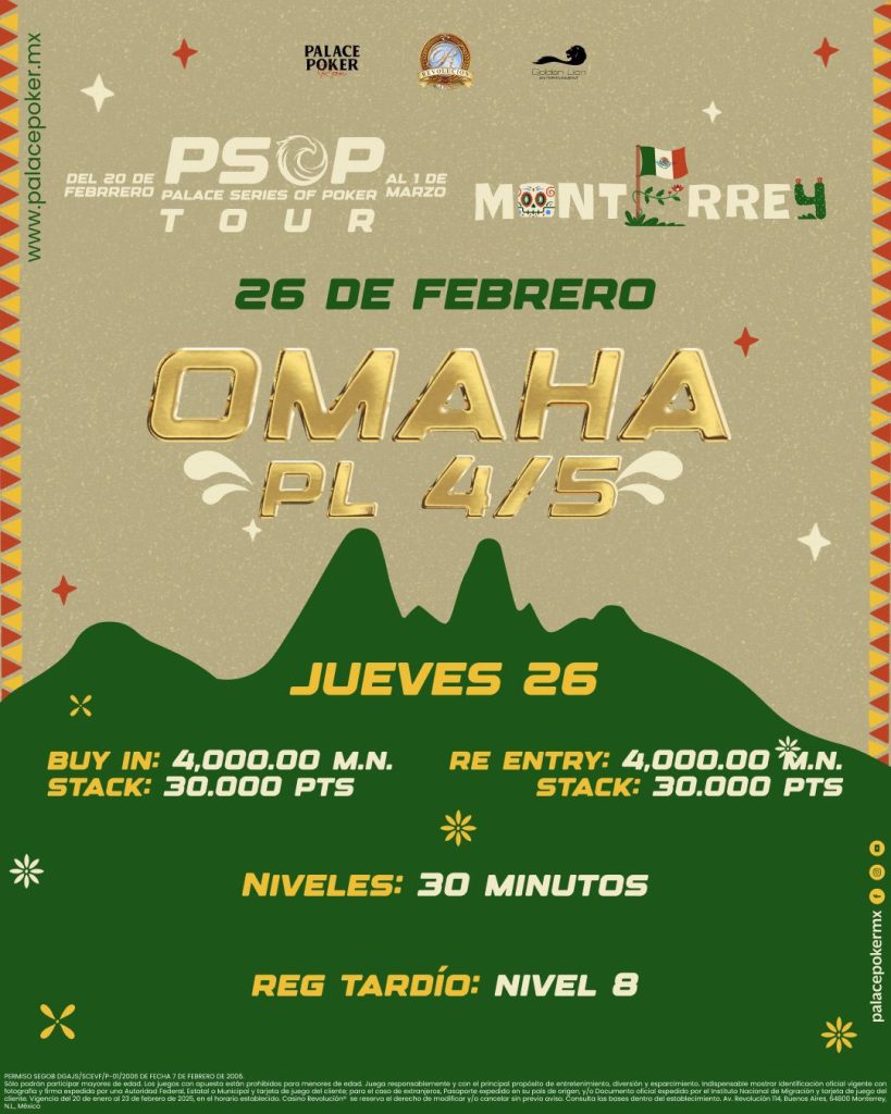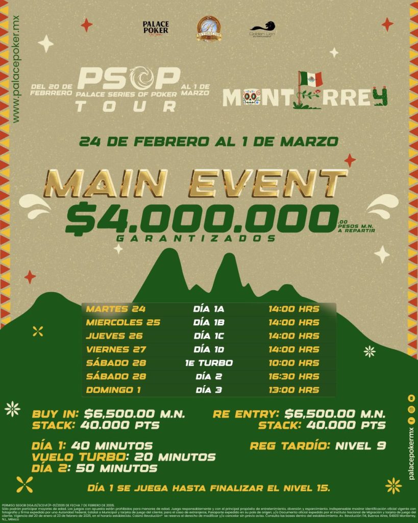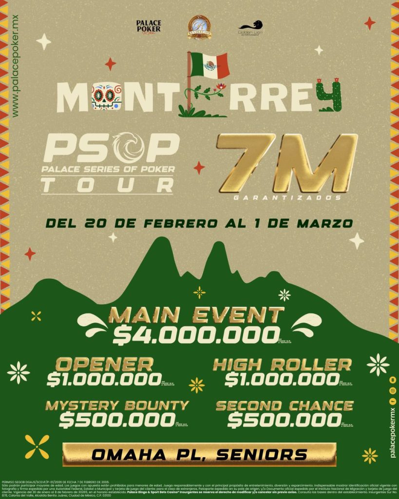 La capital de Nuevo León vivirá la acción de las PSOP entre el 20 de febrero y el 1º de marzo. Esta parada de la serie pondrá en juego un total de MX$7.000.000 (US$403.030), en la sumatoria de las bolsas garantizadas para los eventos incluidos en su programación. La cita central del festival tendrá una bolsa mínima de MX$4.000.000 (US$230.300) e iniciará el martes 24 de febrero. Con un buy-in de MX$6.500 (US$375), esta competencia incluirá cinco vuelos clasificatorios; después de los cuales se pasará a la entrada en premios, durante el Día 2 (sábado 28 de febrero). El campeón se definirá el domingo 1º de marzo, en sesión que iniciará a la 1:00 de la tarde.