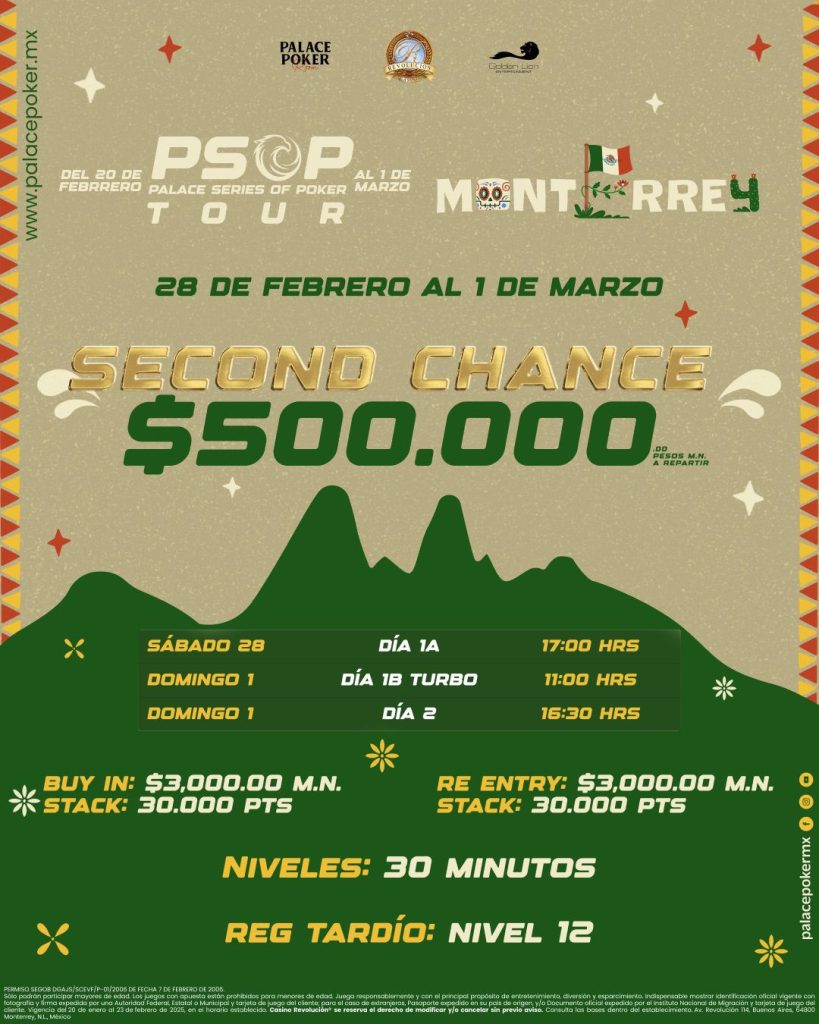 En simultánea a la recta final del Evento Principal, entrará en acción el torneo Second Chance, para el cual se reserva una premiación mínima de MX$500.000 (US$28.790). El evento de la Segunda Oportunidad tiene un buy-in de MX$3.000 (US$175) y se jugará entre el sábado 28 de febrero y el domingo 1º de marzo, con dos vuelos de clasificación y un posterior Día 2, que se extenderá hasta conocer al campeón.