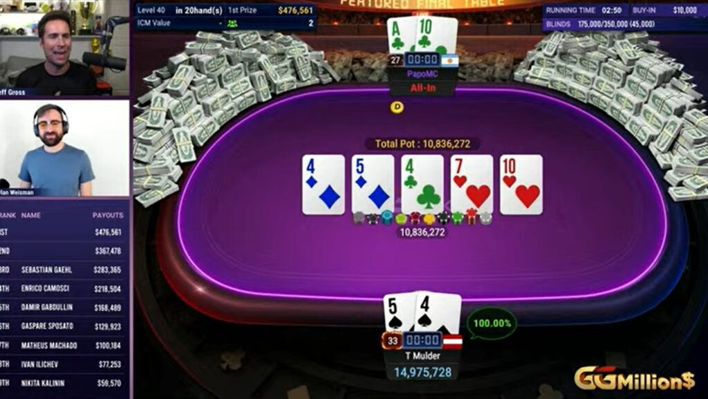 El cantante de hip hop argentino, Alejandro Lococo, más conocido como ‘Papo MC’ entre sus seguidores, logró el subtítulo en el High Roller más mediático de GGPoker. A pesar de verse superado en el duelo final por el neerlandés Teuen Mulder, el del país del tango recibió US$367.478. El campeón, a su vez, se embolsó US$476.561. Los acompañó en el podio el alemán Sebastián Gaehl (US$283.365).