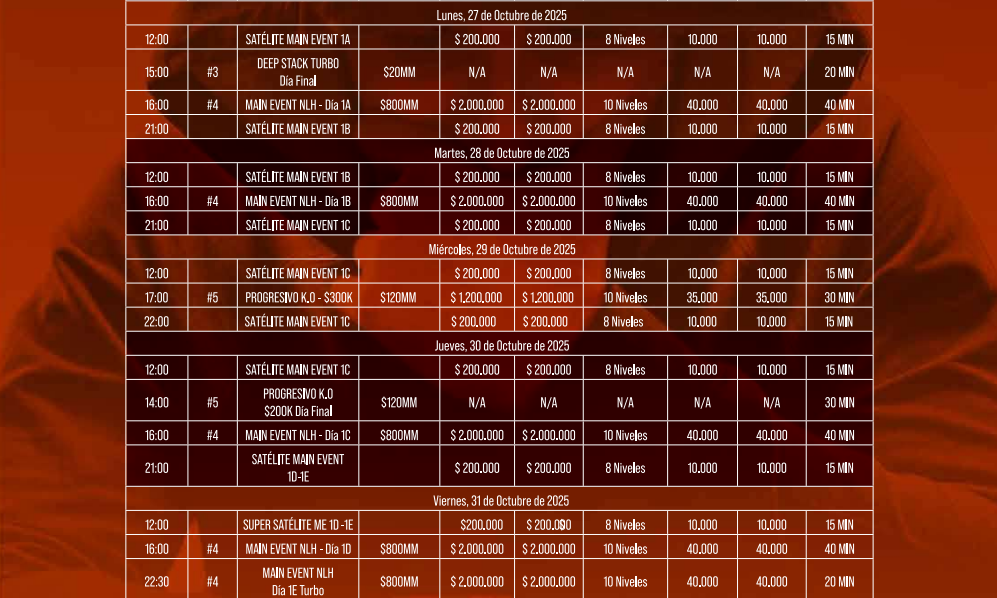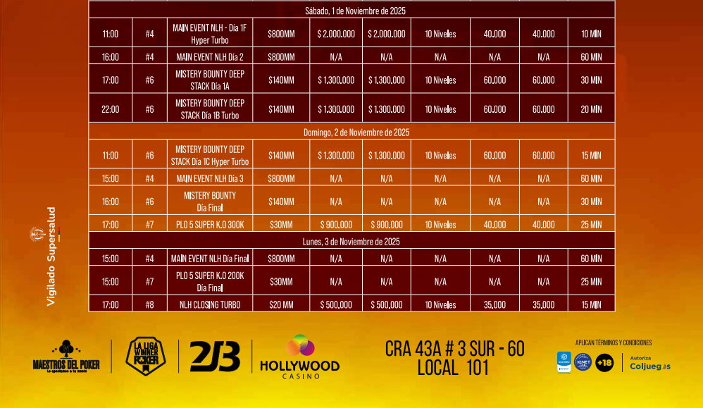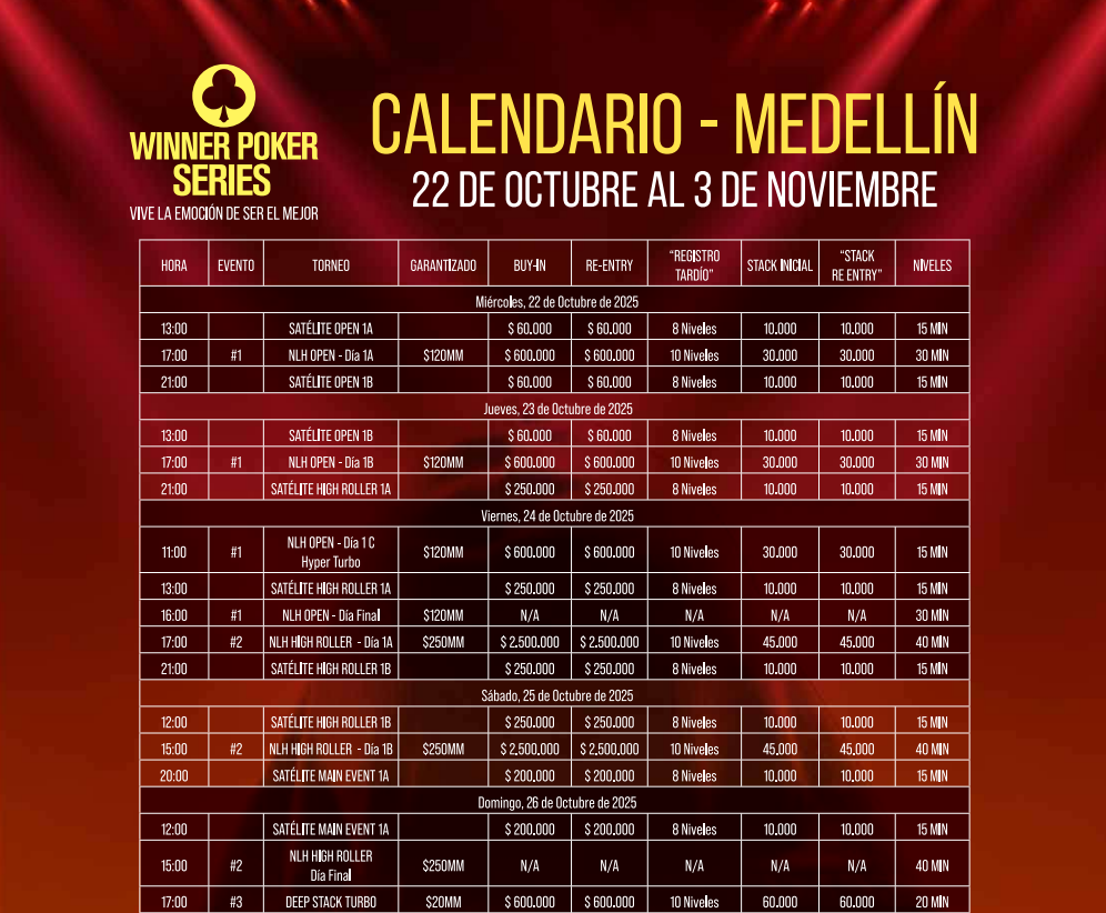 La Winner Poker Series Medellín entra en su punto más caliente con el inicio del Main Event, con buy-in de COP $2.000.000 y una bolsa garantizada de COP $800.000.000. El torneo principal abrió el lunes 27 de octubre y ofrece múltiples vuelos clasificatorios, hoy jueves 30 de octubre, se dará inicio al vuelo 1C a las 4PM (Hora colombia), hasta el último que se disputa el 1 de noviembre: 1F Hyper Turbo (11:00, hora COL). Es la oportunidad ideal para sumarse a la acción en el festival más grande del calendario Colombiano.