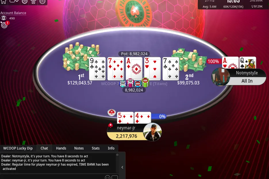 El partido cambió radicalmente cuando Neymar pagó al límite un all-in preflop con J♦ 9♣, solo para toparse con A♣ 9♦ de Ebaaa11, doblando al bosnio. Luego, un bluff fallido en el river dejó más fichas en manos de NotmystyIe, quien pagó con as alto.