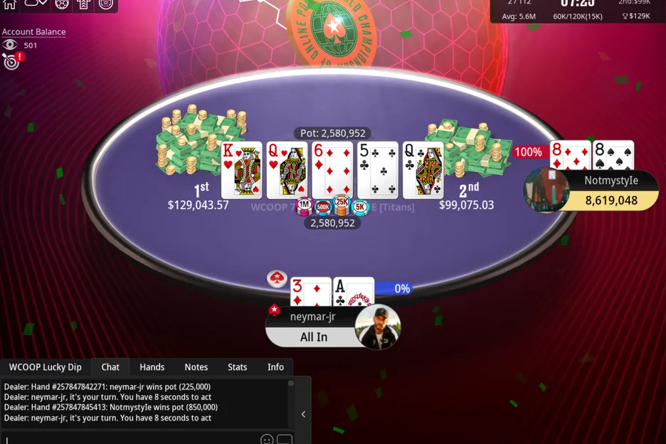 Un par de manos después se selló el desenlace: ambos stacks fueron al centro preflop, con A♣ 3♦ para Neymar y 8♦ 8♠ para NotmystyIe. El board K♥Q♥6♦5♣Q♣ no le ayudó y el brasileño tuvo que conformarse con el subtítulo.