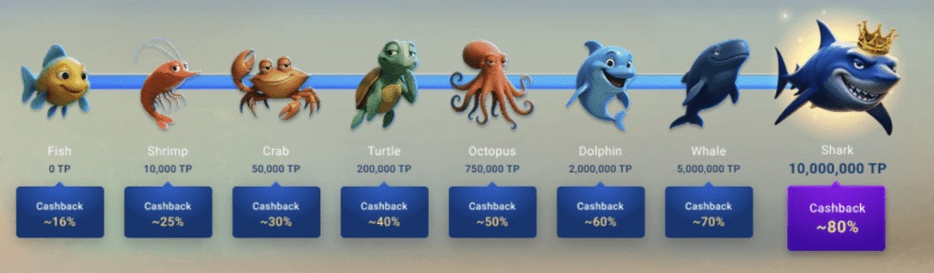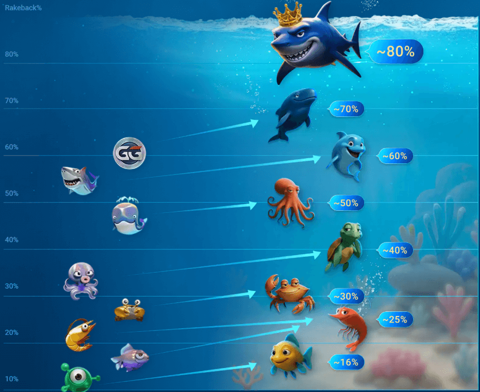 El primer cambio fuerte está en los números. Mientras que el Fish Buffet ofrecía un máximo de 60% de cashback para los jugadores de mayor nivel, Ocean Rewards eleva ese límite hasta 80%.