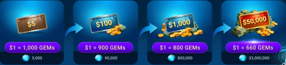 El detalle interesante está en el canje: entre más GEMs cambies de una sola vez, mejor es la conversión. Esto incentiva la planificación y elimina la sensación de “premio aleatorio” que tenia el sistema anterior.