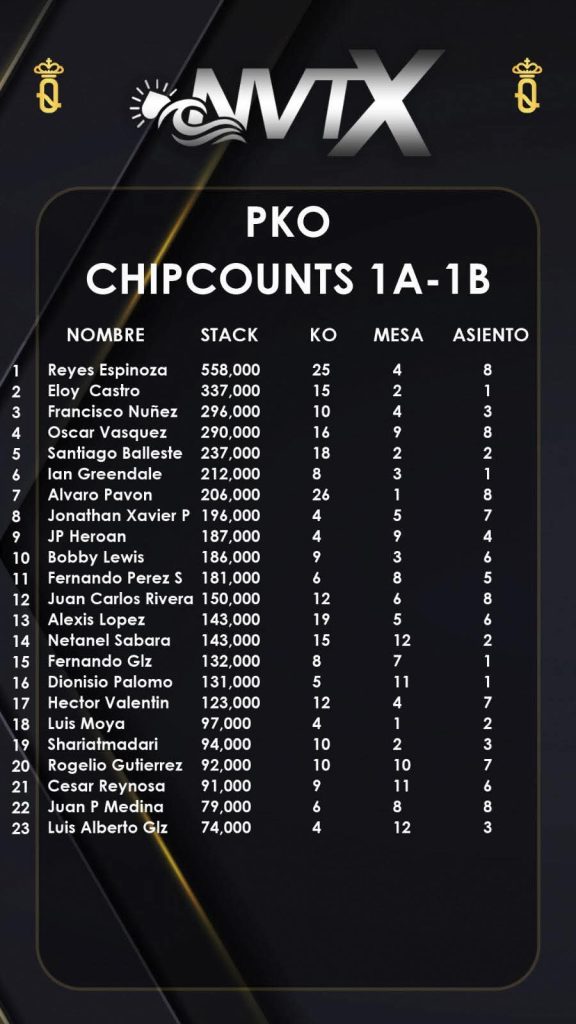 El listado de clasificados para el Día 2, es encabezado hasta ahora por Reyes Espinoza 🇲🇽, líder del vuelo 1A. Con un portentoso stack de 558.000 fichas, tomó un importante margen de ventaja sobre su escolta parcial, Eloy Castro 🇲🇽, quien reportó 337.000 puntos. El podio simbólico del primer día de este evento, se completa con Francisco Núñez 🇲🇽, con 296.000 unidades en su cuenta. Reyes Espinoza también ha logrado una notoria caza de recompensas en esta etapa inicial del torneo, siendo superado solo por Álvaro Pavón 🇲🇽 en ese registro. En imagen adjunta, detallamos el chip count conjunto para los clasificados de los vuelos 1A y 1B, además del asiento que ya les fue asignado para el Día 2.