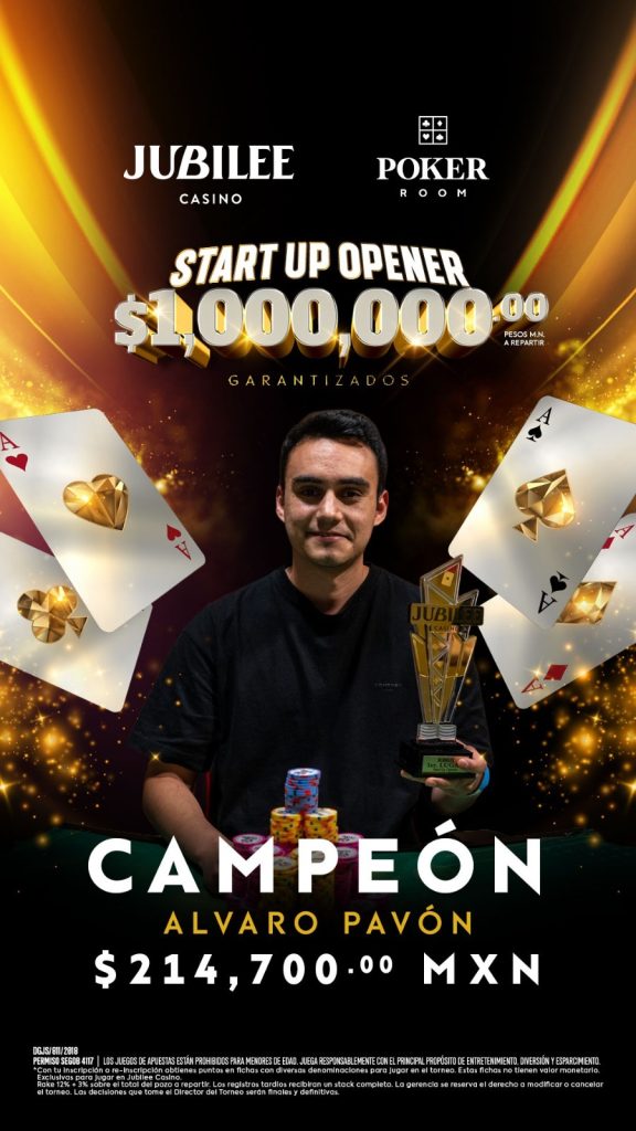 El Festival 6 Millones GTD en Jubilee Casino vivió su primera gran explosión de emociones con el Start Up Opener, un evento que comenzó con un garantizado de MX$1.000.000 y terminó desbordado, alcanzando 518 entradas y una bolsa total de MX$1.319.078. Álvaro Pavón se coronó campeón, llevándose a casa la jugosa cifra de MX$214.700 tras un acuerdo a 3 bandas en el que pactaron, junto con Manuel Rangel (2° por MX$198.500) y Francisco González (3° por MX$174.500).