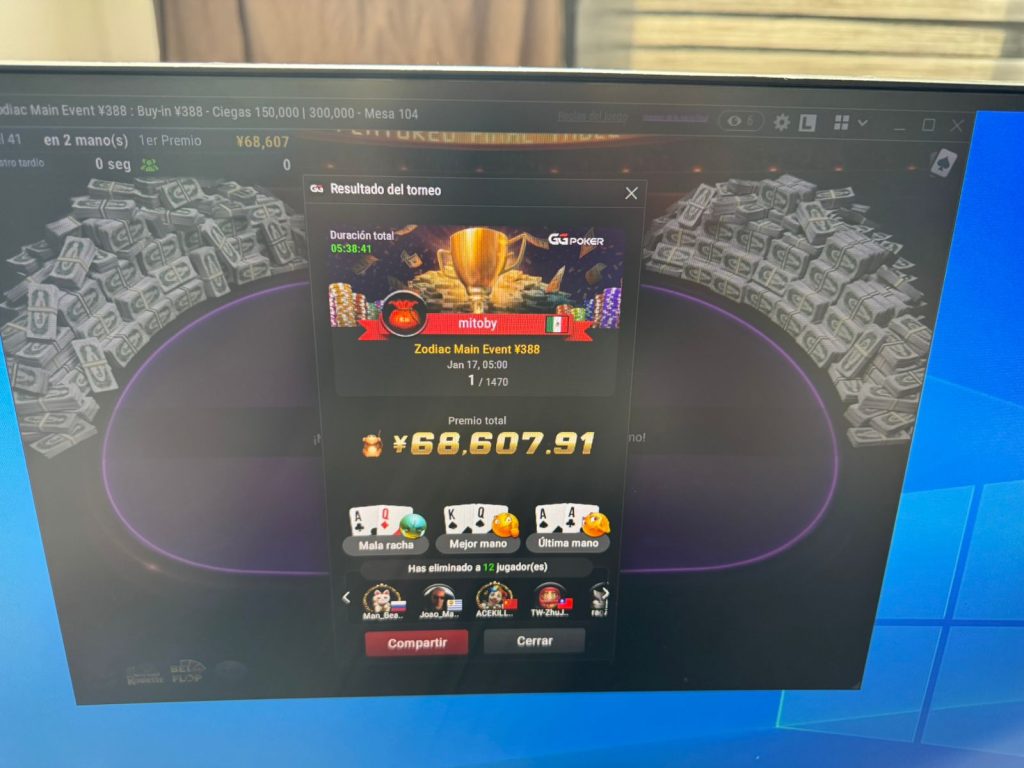 Tadeo 🇲🇽 logró imponerse en el Zodiac Main Event ¥388 disputado en GGPoker, superando un field de 1.470 jugadores para quedarse con el primer lugar y un premio total de ¥68,607.91 Yuanes ó US$9,844.
