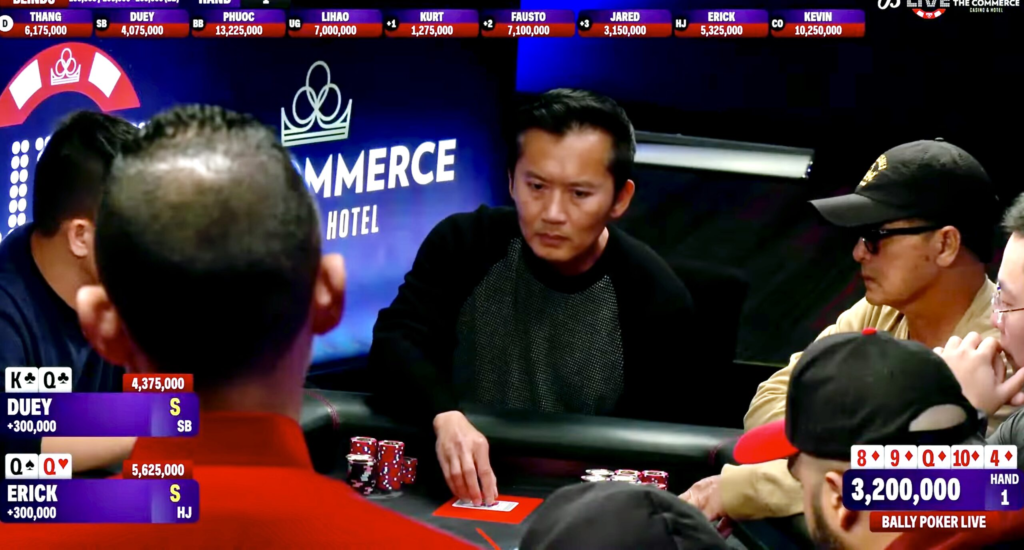 El agresor inicial tenía una clara ventaja con su pareja de damas, frente al KQ de tréboles con el que le hizo frente Dong. El flop lo dejó aún más adelante, al virarse Q-9-8, todo de diamantes. Ordóñez hizo una apuesta de continuación por 400.000 puntos, que Duey cubrió, luego de haber cedido la iniciativa. Al turn vino el 10 de diamantes y el de la ciega menor se aventuró a tomar la iniciativa, con una postura de 500.000 fichas, que Erick no tardó en pagar. El river fue el 4 de diamantes y los dos oponentes pasaron.