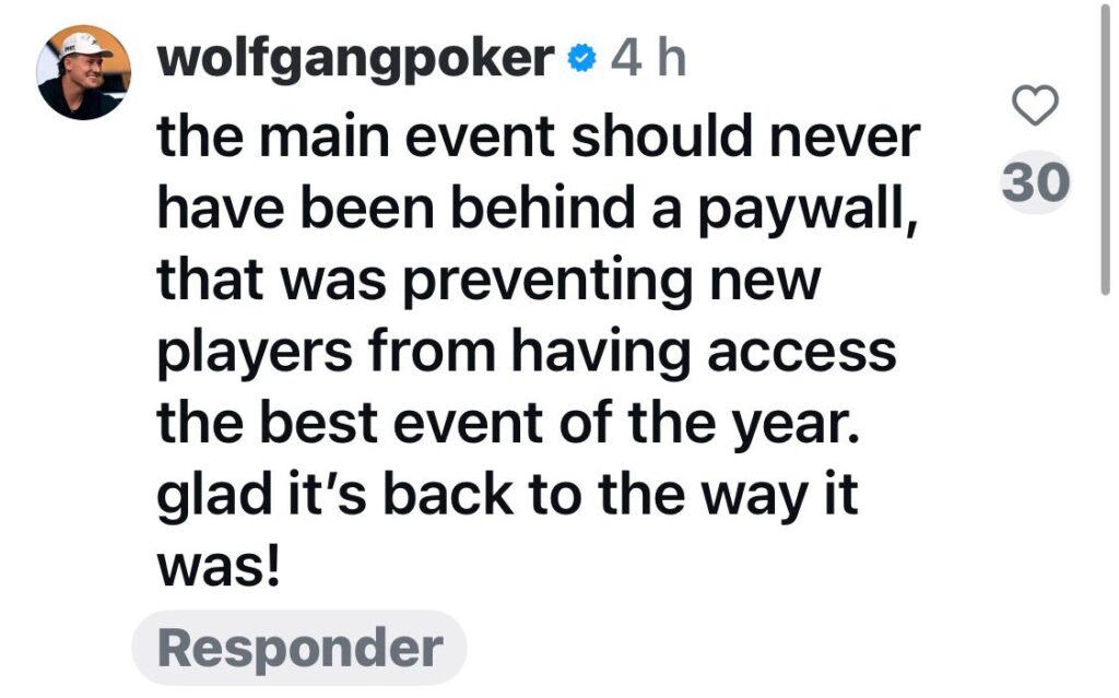 El creador de contenido y jugador profesional de poker, WolfgangPoker 🇺🇸 lo resume sin rodeos en sus redes sociales… el Main Event nunca debió estar detrás de un paywall. Limitar el acceso reduce la llegada de nuevos jugadores. La televisión abierta fue y sigue siendo el punto de entrada más poderoso para el poker.